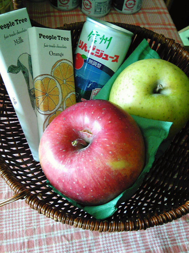 美味しい夢りんごの赤りんごと青りんご、フェアトレードチョコレート二枚、