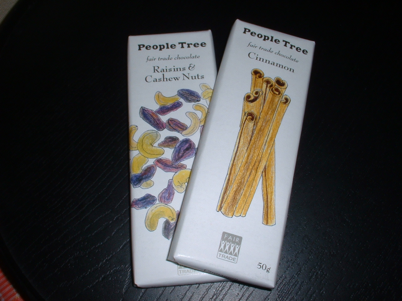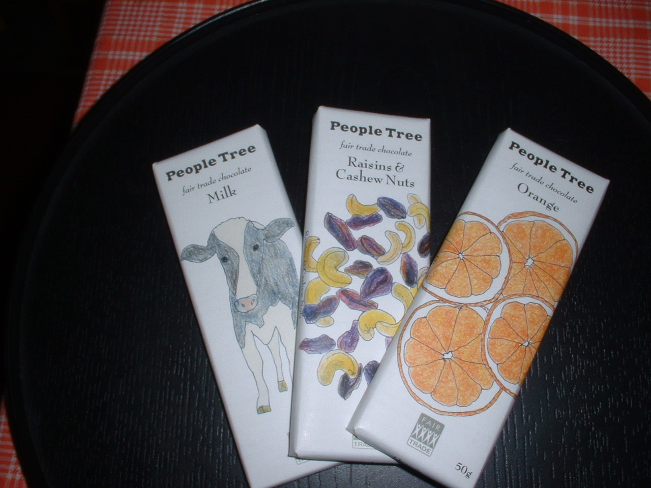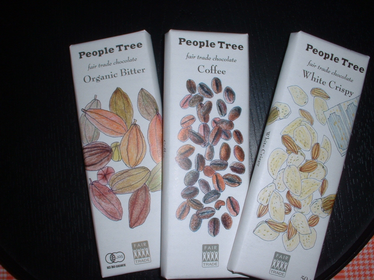 お待たせしました。ピープルツリーのフェアトレードチョコレイト、ちょっとへたくそですが、左からミルク、レーズンカシュー、オレンジです。パッケージが可愛く、お店で全種類の写真を撮る女性客もいます。